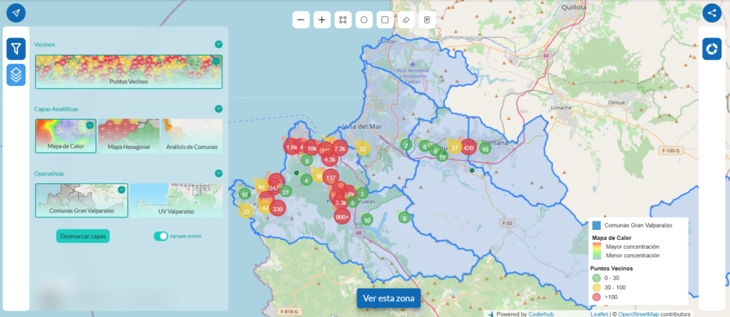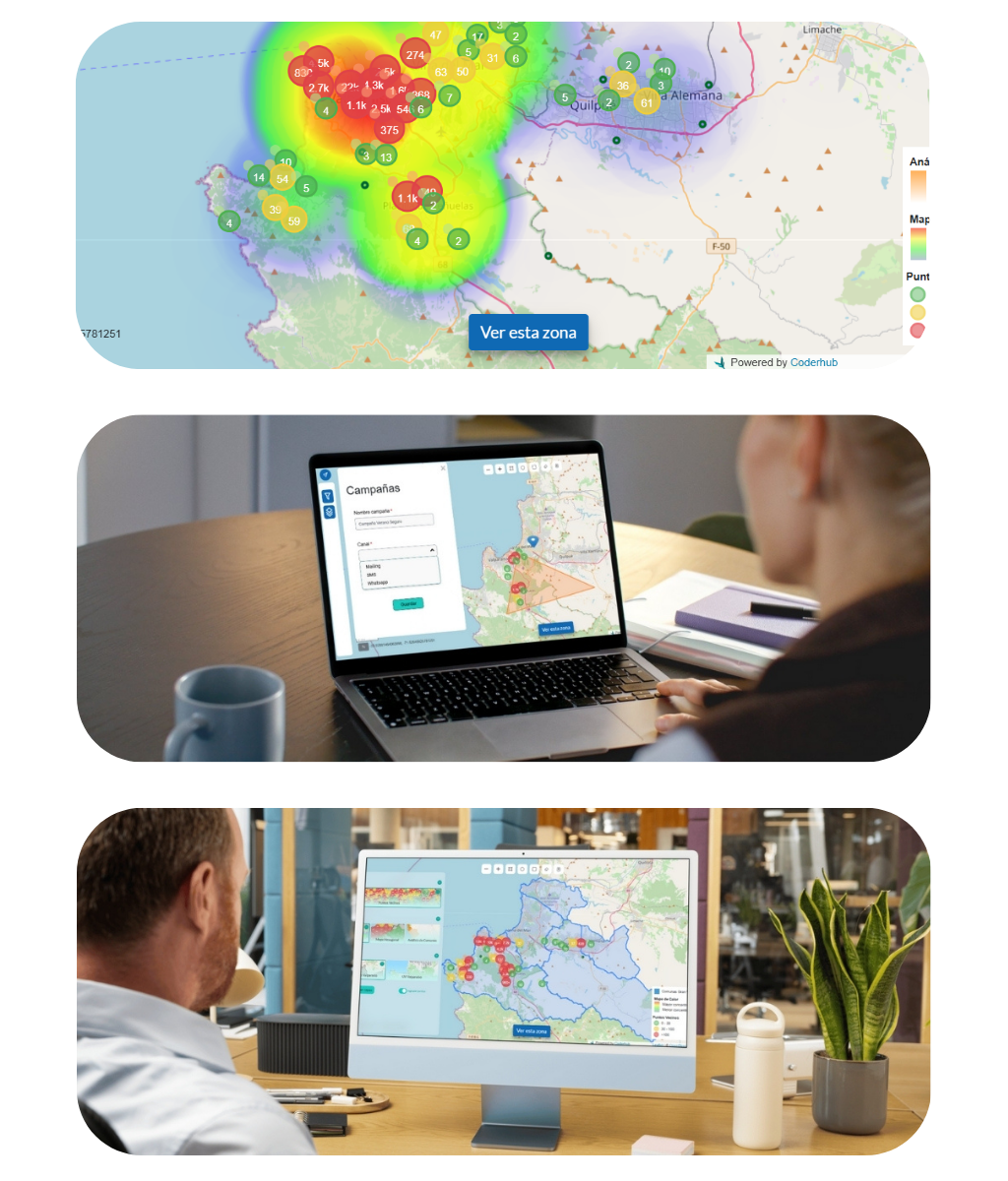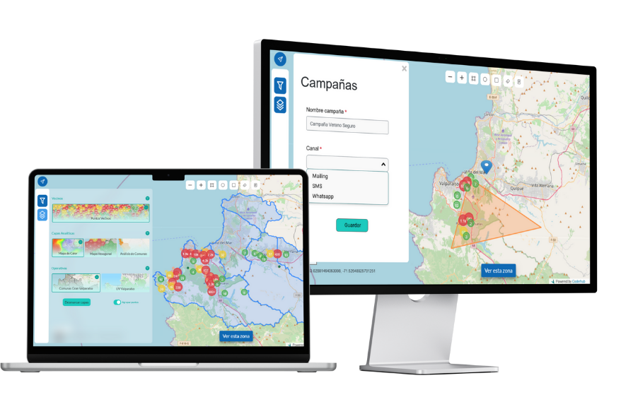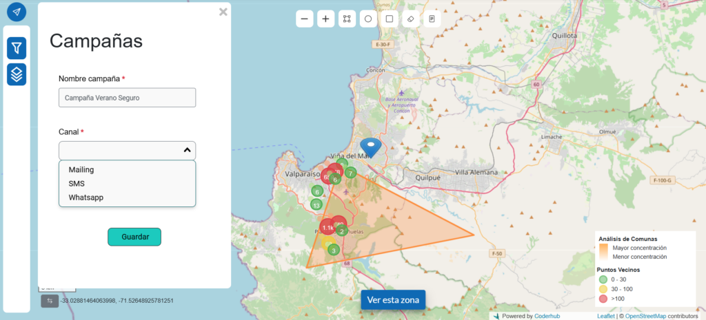 Además la Plataforma permite crear nuevos filtros y nuevas listas de contactos, para ser visualizados de manera georreferenciada, junto al desarrollo de un módulo de carga masiva de contactos. Coderhub se encarga de realizar el resguardo de los datos cifrados, para garantizar el resguardo de éstos.